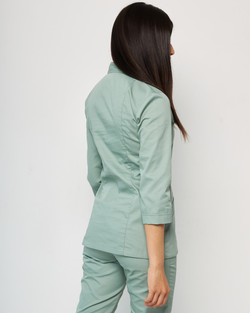 Медичний верх «Сакура» має напівприталений фасон та рукав довжиною три чверті. Комір-стійка та декоративні контрастні планки рядки додають образу стриманості. Сорочка застібається на металеві кнопки, заховані за декоративною планкою.
