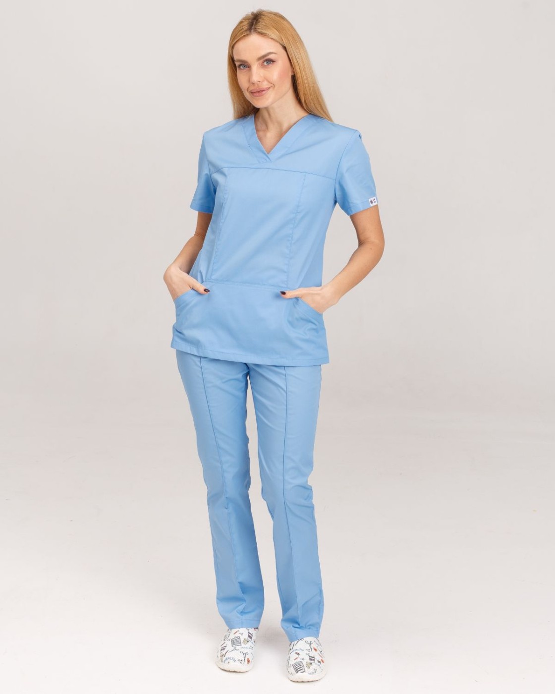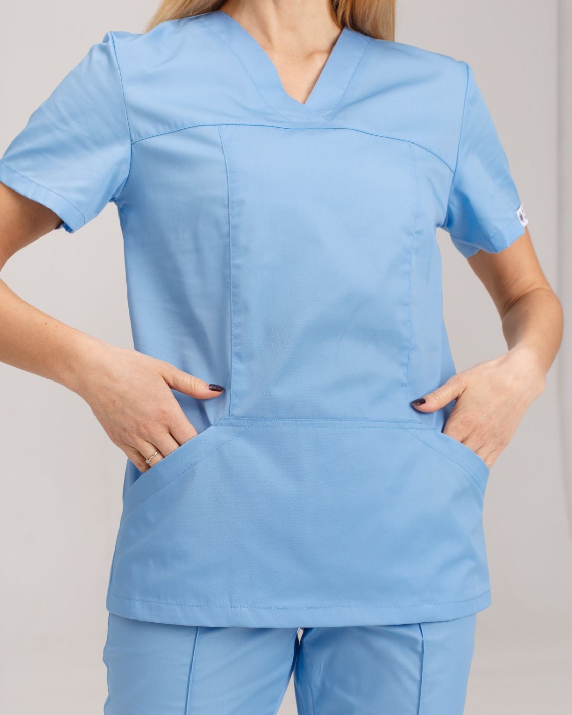 Жіноча медична сорочка «Топаз» напівприталеного силуету має короткі втачні рукави та велику накладну кишеню-кенгуру. Лицьова частина декорована прямою кокеткою і рельєфними швами вертикально розташованими. Зручний V-виріз горловини забезпечує відчуття комфорту весь активний робочий день.