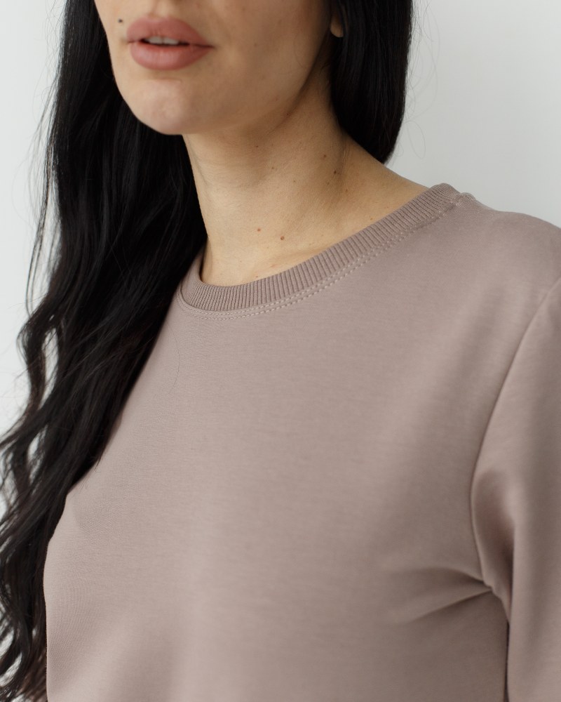 Кофта-світшот у розмірі oversize виготовлена у вільному фасоні з трикотажного полотна тринитка. У складі 95% бавовни та 5% еластану. Матеріал приємний на дотик і добре пропускає повітря. Рукави, горловина та низ світшота обрамлені еластичною рибаною, завдяки чому кофту легко вдягати та комфортно носити. На лівому манжеті розташована бирка з вишитим фірмовим логотипом.