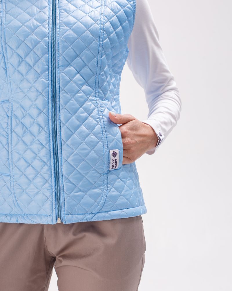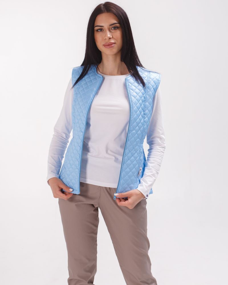 Стіганий жилет на блискавці, виконаний з плащової тканини і утеплений синтепоном 120. Має напівприталений фасон і дві місткі кишені. У складі 100% поліестер. Медичний утеплений жилет має дві втачні кишені і круглий виріз горловини. Модель має високу зносостійкість і практичність у використанні. Жилетка представлена в різних кольорах на вибір.