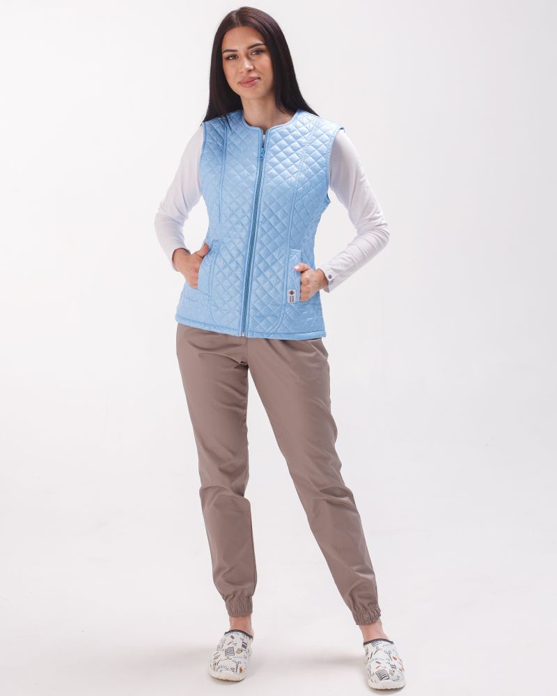 Стіганий жилет на блискавці, виконаний з плащової тканини і утеплений синтепоном 120. Має напівприталений фасон і дві місткі кишені. У складі 100% поліестер. Медичний утеплений жилет має дві втачні кишені і круглий виріз горловини. Модель має високу зносостійкість і практичність у використанні. Жилетка представлена в різних кольорах на вибір.