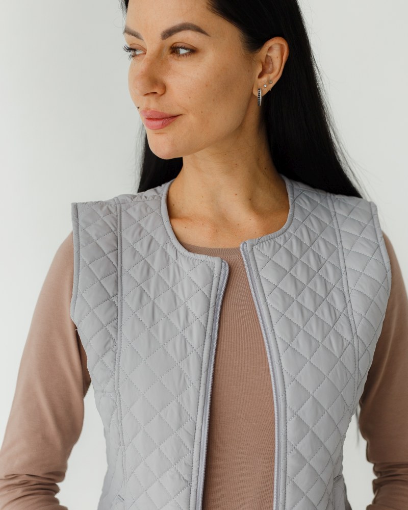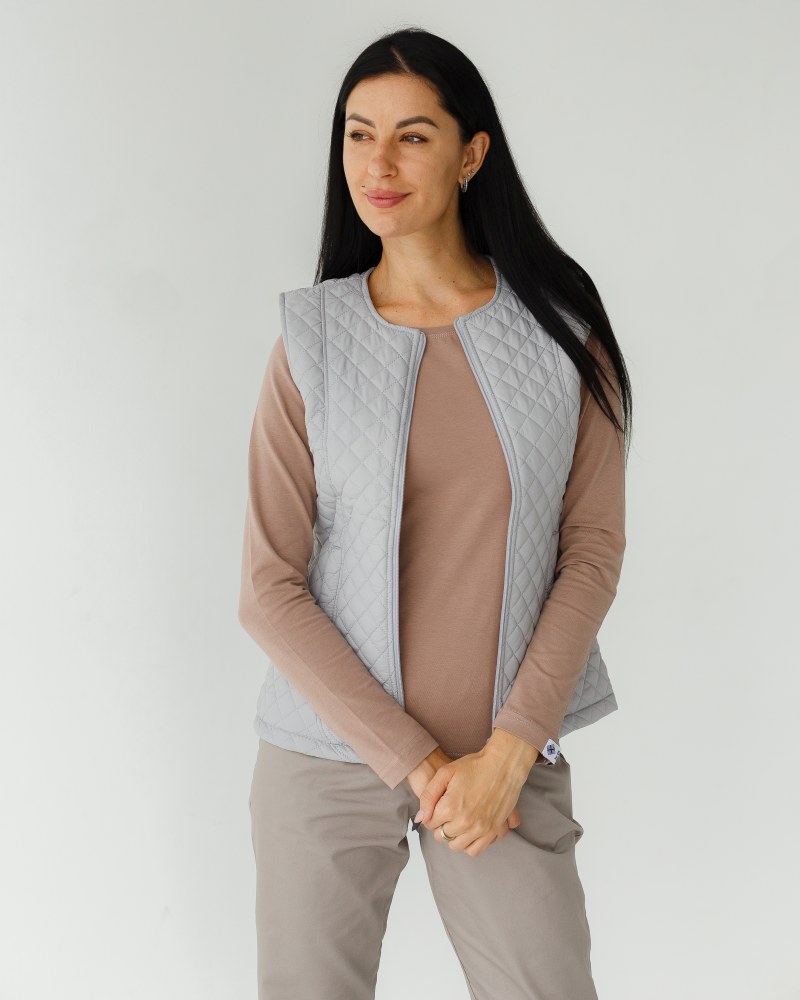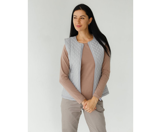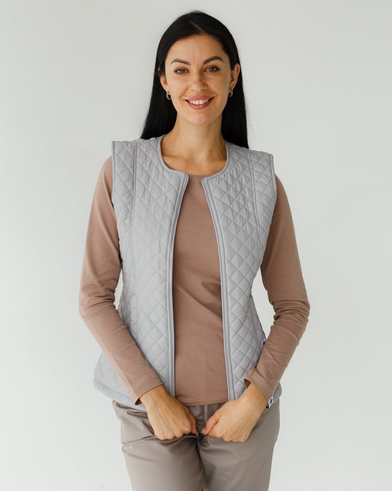 Стіганий жилет на блискавці, виконаний з плащової тканини і утеплений синтепоном 120. Має напівприталений фасон і дві місткі кишені. У складі 100% поліестер. Медичний утеплений жилет має дві втачні кишені і круглий виріз горловини. Модель має високу зносостійкість і практичність у використанні. Жилетка представлена в різних кольорах на вибір.