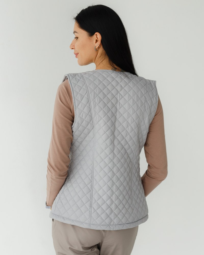 Стіганий жилет на блискавці, виконаний з плащової тканини і утеплений синтепоном 120. Має напівприталений фасон і дві місткі кишені. У складі 100% поліестер. Медичний утеплений жилет має дві втачні кишені і круглий виріз горловини. Модель має високу зносостійкість і практичність у використанні. Жилетка представлена в різних кольорах на вибір.