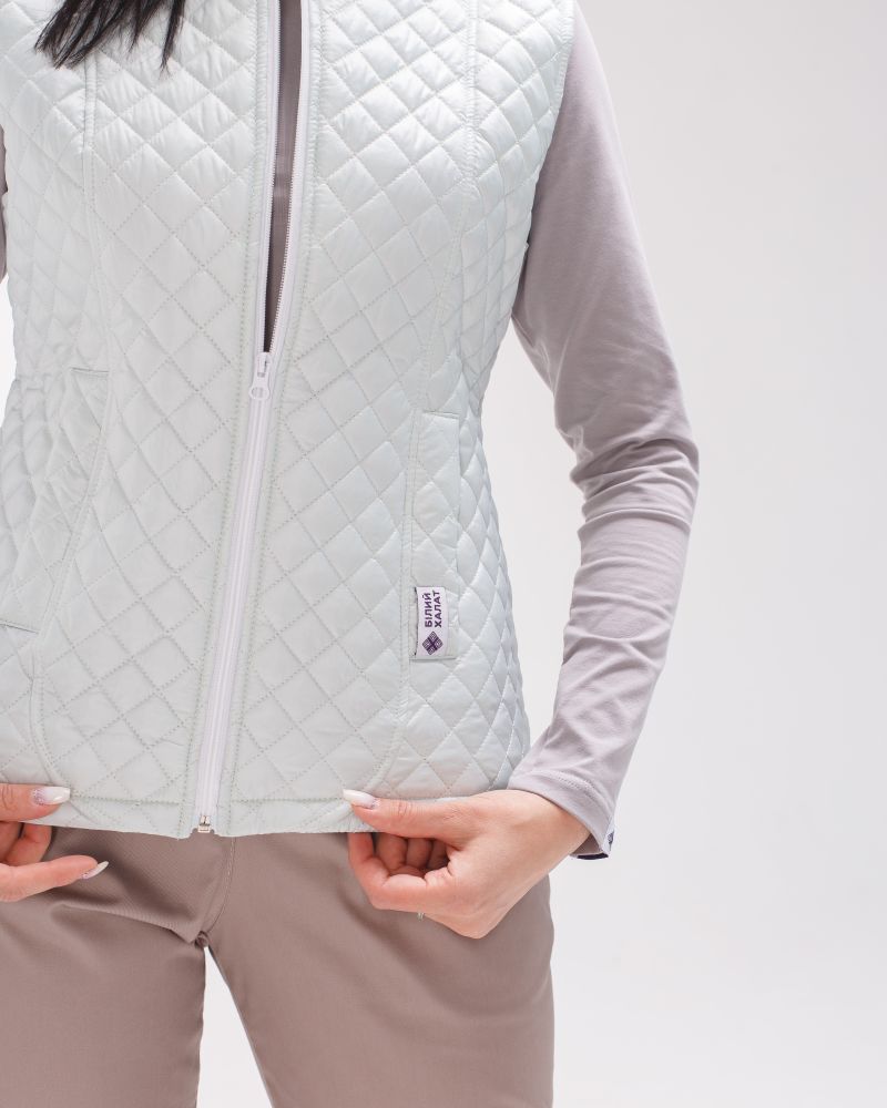 Стіганий жилет на блискавці, виконаний з плащової тканини і утеплений синтепоном 120. Має напівприталений фасон і дві місткі кишені. У складі 100% поліестер. Медичний утеплений жилет має дві втачні кишені і круглий виріз горловини. Модель має високу зносостійкість і практичність у використанні. Жилетка представлена в різних кольорах на вибір.