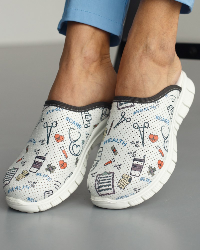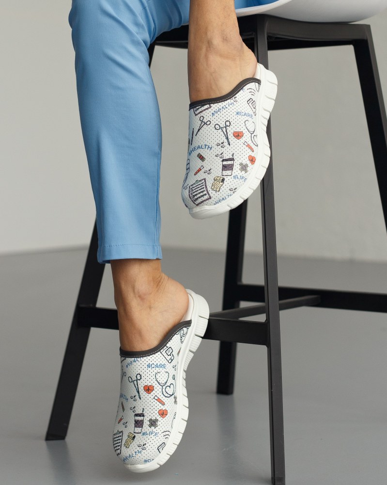 Медичне взуття жіноче сабо з підошвою Lite має широку закриту верхню частину з об'ємним носком, у якому пальці ніг вільно рухаються. Перфорація носіння медичного взуття забезпечує рух повітря та відведення вологи, ноги не пітніють. Таке медичне взуття для жінок виглядає стильно за рахунок дизайнерських тематичних принтів, які легко впишуться у ваш гардероб. Медичне взуття сабо з підошвою Lite легке, пластичне, не обмежує рухів та повторює форму стопи під час ходьби. Якщо ви бажаєте купити медичні капці в яких забудете про втому в ногах - жіночі медичні сабо з підошвою Lite найкращий варіант для вас.