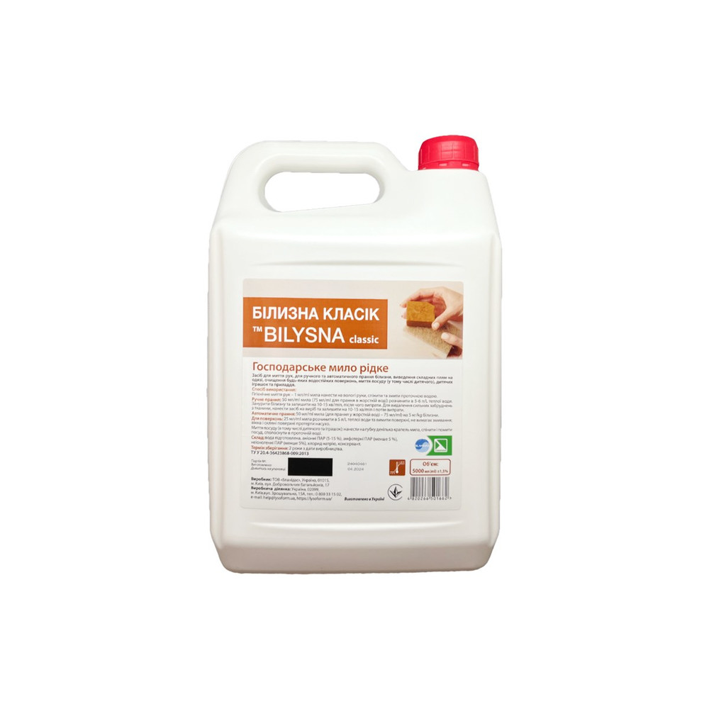 «Білизна класік (ТМ Bilysna classic)» – засіб для миття рук, для ручного та автоматичного прання білизни, виведення складних плям на одязі, очищення будь-яких водостійких поверхонь, миття посуду (у тому числі дитячого), дитячих іграшок та приладдя.