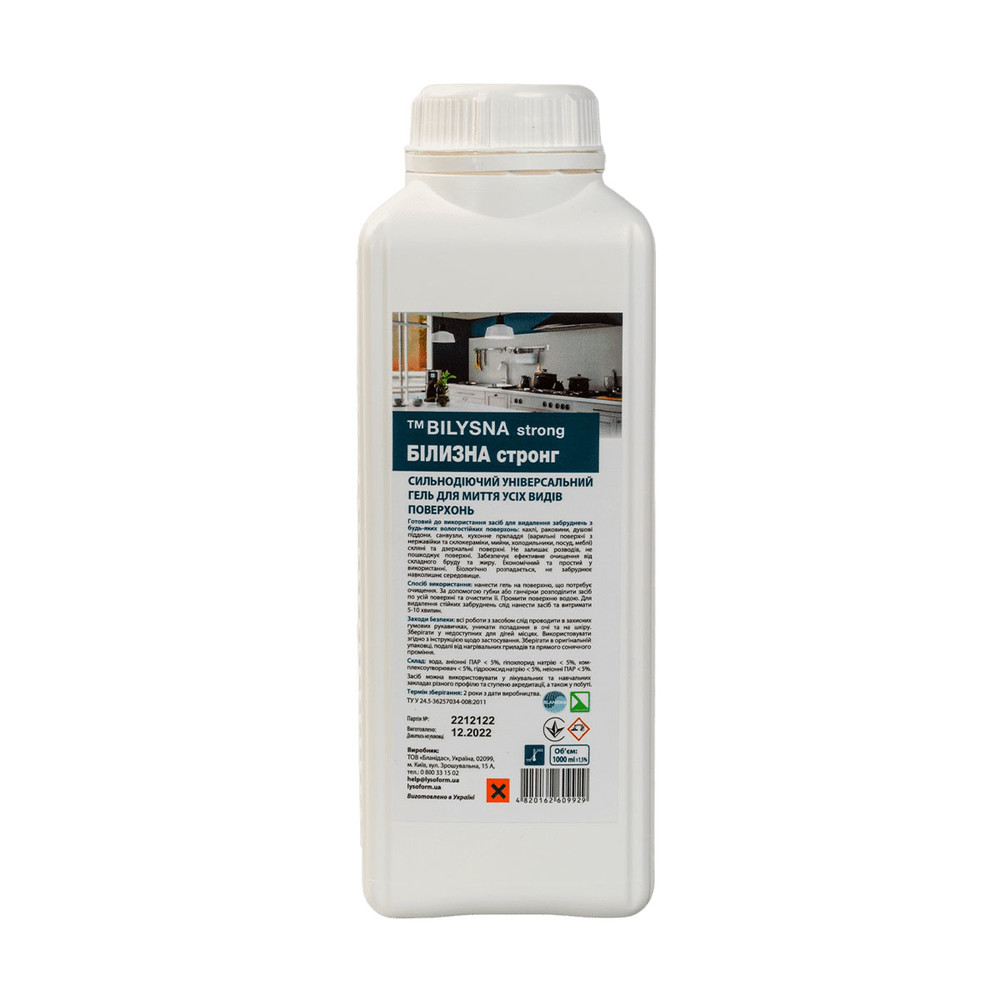Засіб Білизна стронг (Bilysna strong) – готовий до використання засіб для видалення забруднень з будьяких вологостійких поверхонь: кахлі, раковини, душові піддони, санвузли, кухонне приладдя (варильні поверхні з нержавійки та склокераміки, мийки, холодильники, посуд, меблі), скляні та дзеркальні поверхні.