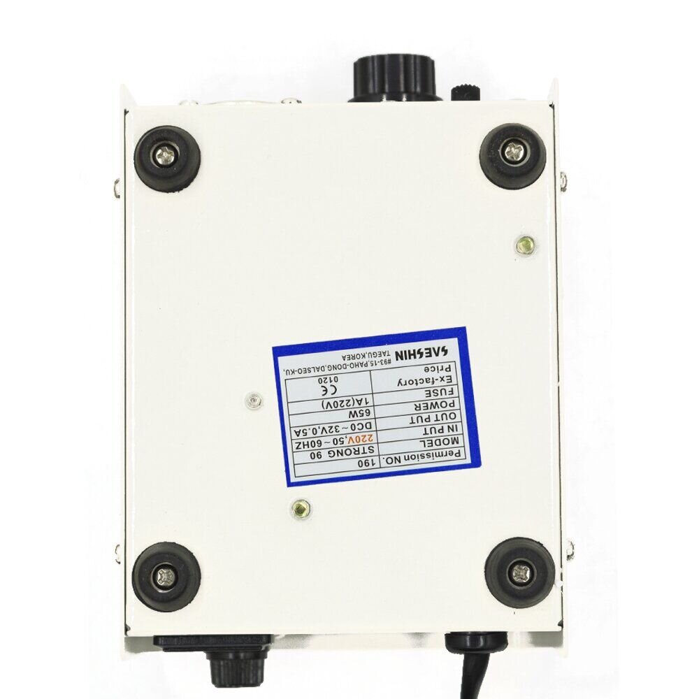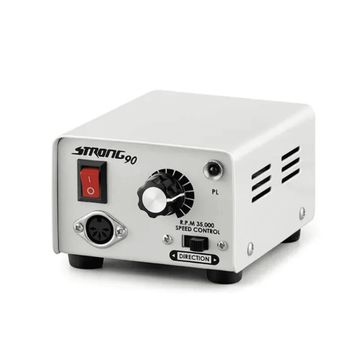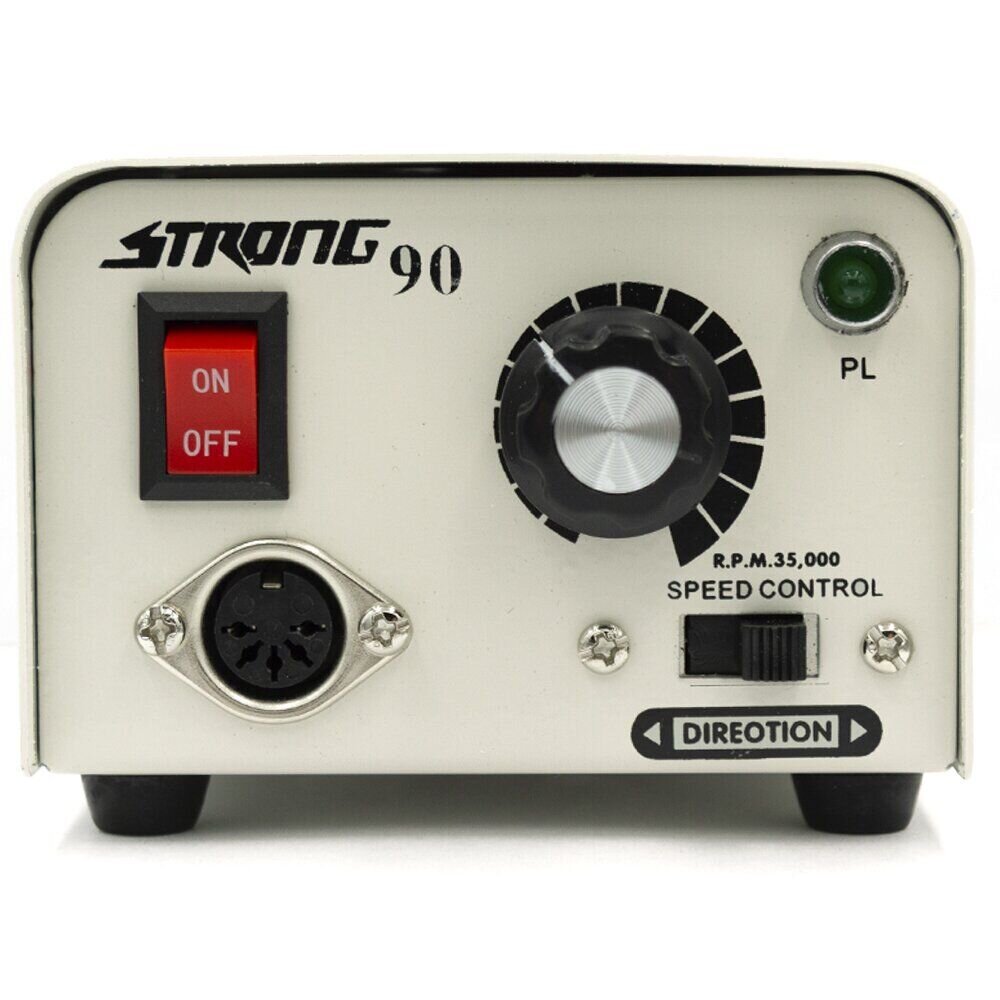 На ній є кнопка перемикання реверсу, регулятор швидкості, світлодіодний індикатор і роз'єм для підключення самої ручки. З заднього боку є роз'єм для підключення педалі, педаль дозволяє тільки включити або виключити фрезер. Strong 90 відомий своєю унікальністю, потужністю і багатофункціональністю не тільки в манікюрних салонах.