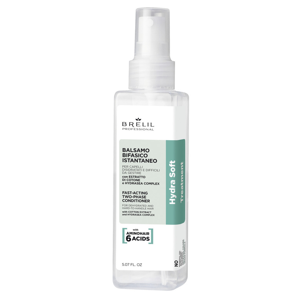 Brelil Fast-Acting Two-Phase Conditioner Hydra Soft Treatment – двофазний кондиціонер миттєвої дії для зневодненого волосся та волосся, з яким важко впоратися. Формула засобу миттєво кондиціонує і пом'якшує волосся, роблячи його м'яким і розплутуючим одним рухом. Волосся миттєво стає більш м'яким і блискучим.