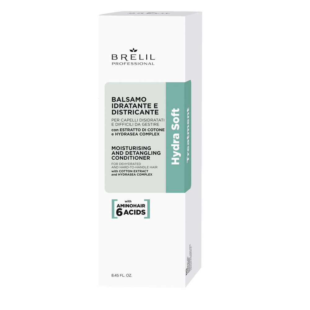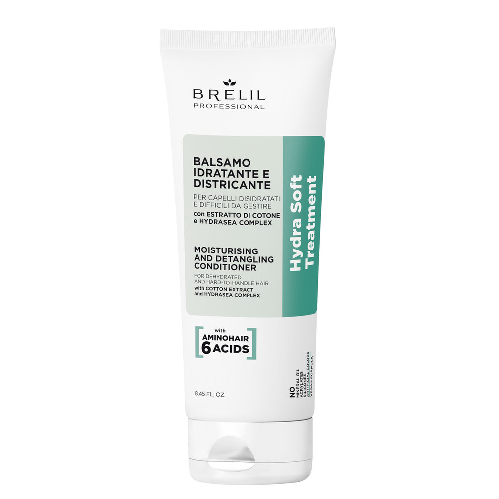 Кремова формула кондиціонера Brelil Moisturising And Detangling Conditioner Hydra Soft Treatment допомагає відновити ліпідний бар'єр волосся, забезпечити зволоження, не обтяжуючи його. Засіб для шовковистого, надм'якого та розплутувального волосся.