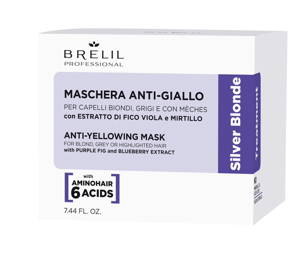 Brelil Anti-Yellow Mask Silver Blonde – маска проти жовтизни для світлого та мелірованого волосся. Її формула посилює колір світлого і сивого волосся, надаючи яскравості холодним відблискам і інтенсивно протидіючи жовтизні; одночасно розплутує волосся і робить його м'яким.