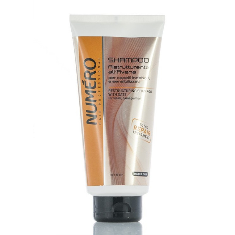 Шампунь Brelil Numero, що відновлює, на основі екстракту вівса призначений для використання для інтенсивного живлення та відновлення волосся всіх типів. Шампунь надає волоссю еластичність, пружність та блиск. Секрет шампуню в його особливій формулі на основі екстракту вівса з високим вмістом протеїнів, з яскраво вираженими нормалізуючими та живильними властивостями. По всій довжині волосся утворюється тонка плівка, яка обволікає волосся і пошкоджені кінчики, помітно відновлюючи їх.