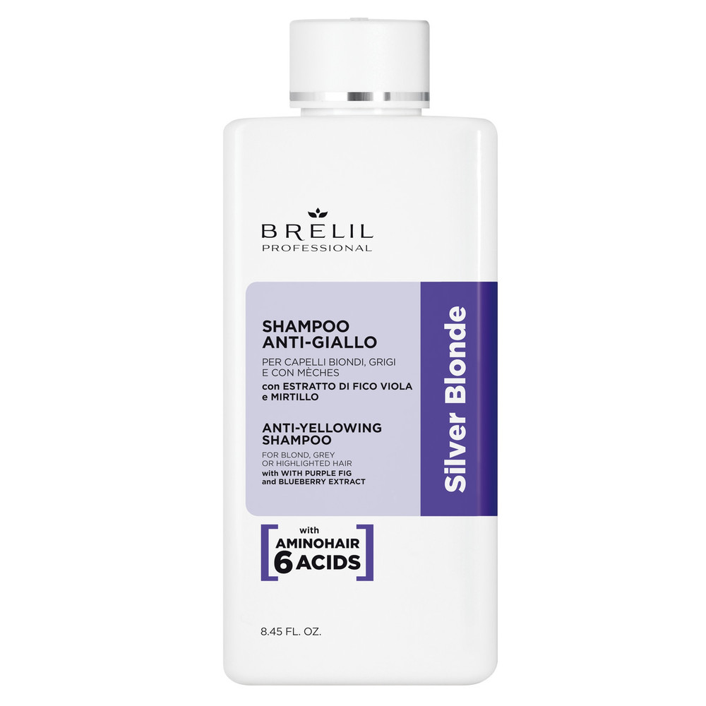 Brelil Anti-Yellow Shampoo Silver Blonde Treatment – шампунь проти жовтизни для світлого та мелірованого волосся. Його технологічна формула з характерною фіолетовою текстурою посилює природний блиск світлого волосся і пожвавлює срібні відблиски сивого волосся, нейтралізуючи його схильність до жовтизни і роблячи волосся шовковистим і м'яким.
