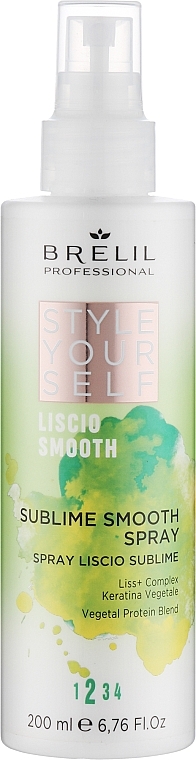 Style Yourself Smooth Sublime Smooth Spray — спрей для волосся, що розгладжує, є одним з найвдаліших рішень проблеми контролю над неслухняними локонами. Формула цього засобу для стайлінгу та догляду створена фахівцями бренду Brelil. До неї включені цінні натуральні інгредієнти. Завдяки їхньому активному впливу лусочки зовнішнього шару волосся щільно притискаються до стрижнів. За рахунок цього пасма стають шовковисто гладкими та м'якими без склеювання та ефекту обтяження. Одночасно з випрямленням локонів б'юті-продукт забезпечує їм захист від сонця та вологи.