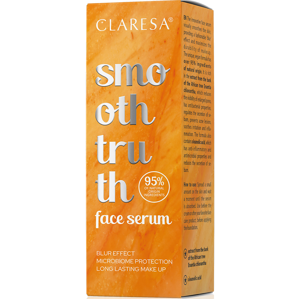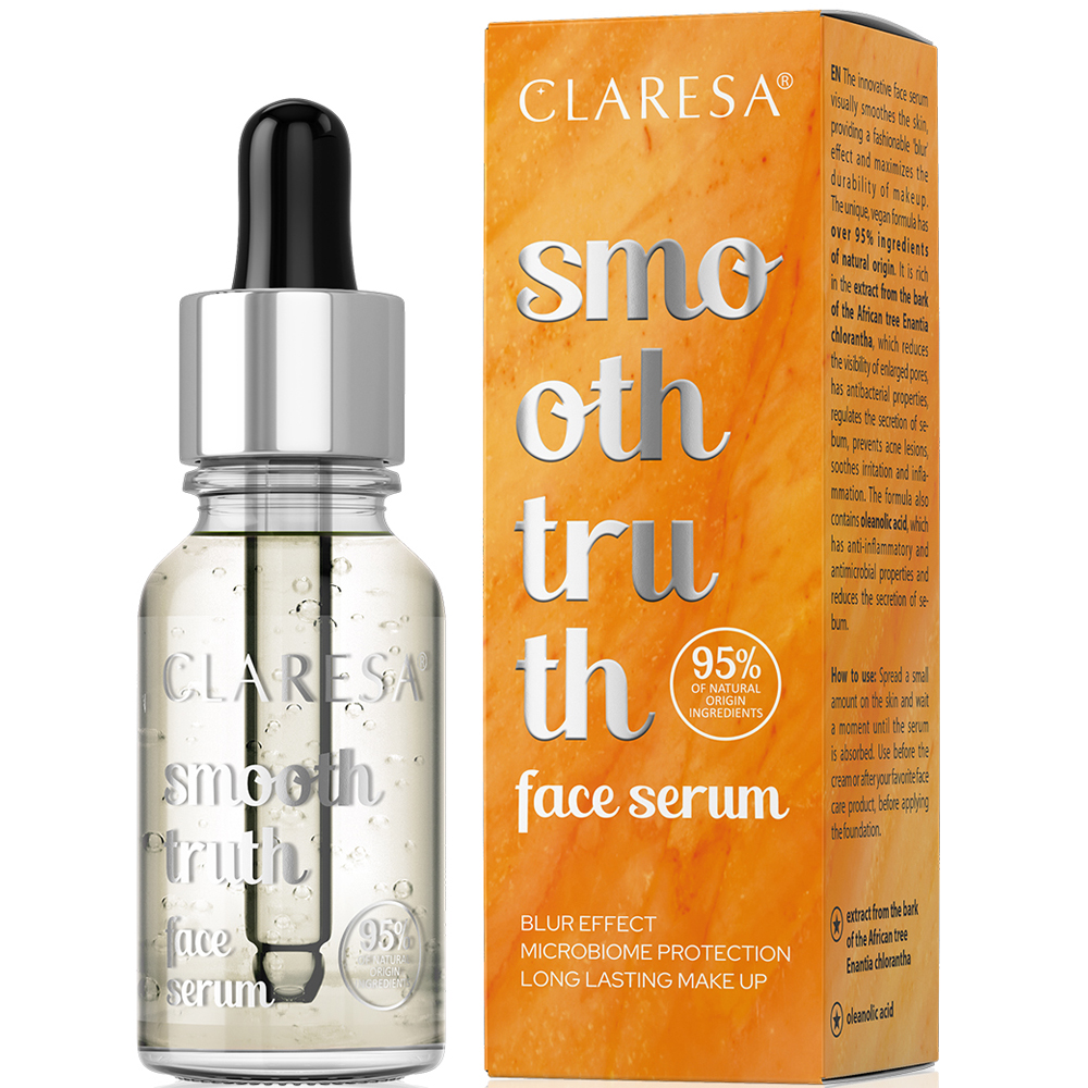 Відкрийте справжню красу шкіри із сироваткою Smooth Truth від бренду Claresa. Її збалансований склад підібраний з метою надати вам найкращий догляд. Serum For Faces без масного ефекту створює невагому плівку, чудово зволожує та стимулює процеси відновлення. Насичений поживними властивостями цей б'юті-продукт дозволяє швидко покращити зовнішній вигляд обличчя. Засіб збагачений активними компонентами (екстрактом кори африканського дерева Enantia chlorantha, олеаноловою кислотою) з підтвердженою ефективністю, гарантуючи епідермісу красу та здоров'я.