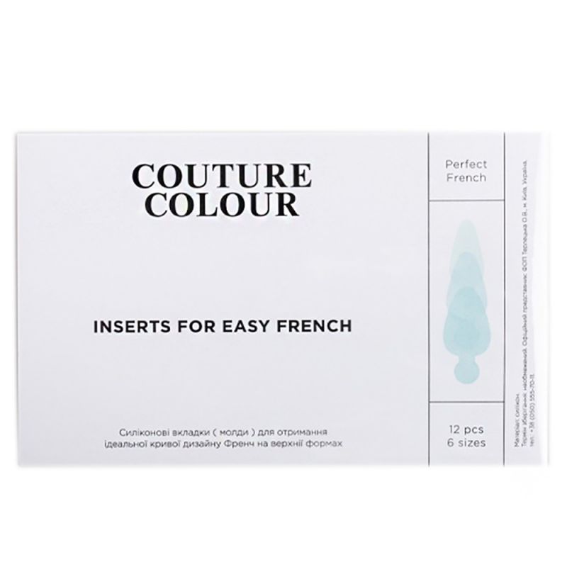 Силіконові вкладки-молди Couture Colour Inserts For Easy French – унікальні вироби, призначені для викладного френча на верхніх формах. Легко встановлюються у будь-яку форму, забезпечують швидке створення ідеальної лінії "усмішки" або контуру, значно спрощуючи процес нанесення акрил-гелю або інших нейл-матеріалів. Призначені для багаторазового використання.