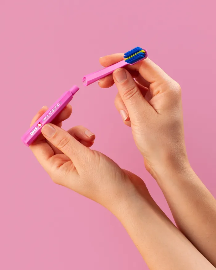 Ви тримаєте ручку вашої зубної щітки CS 5460 ortho travel. Ви отримуєте дві нові насадки для щіток. Прикріпіть нову голівку щітки до ручки. Робота зроблена. Менше відходів!