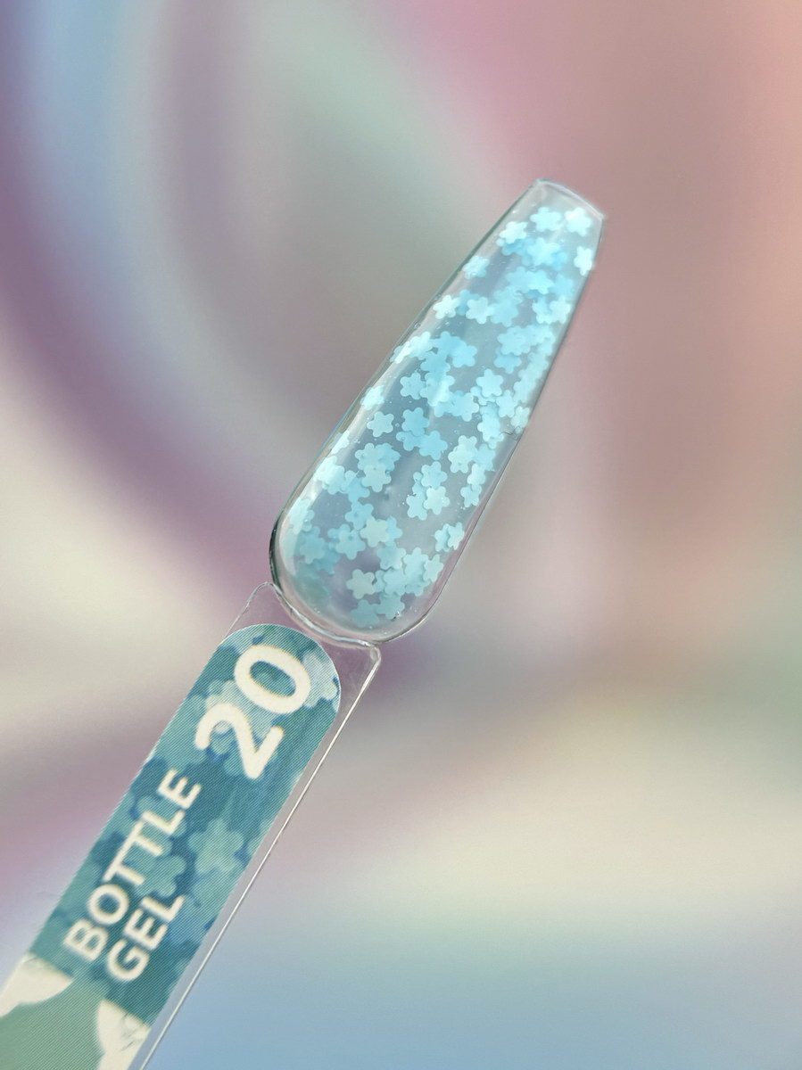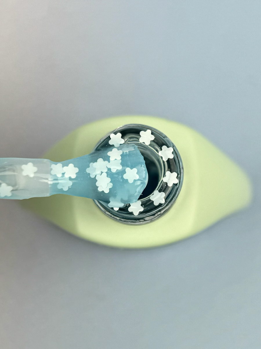 BOTTEL GEL містить декоративні фігурки у формі квітів, які надають покриттю ніжного та витонченого вигляду без потреби у додатковому декорі.