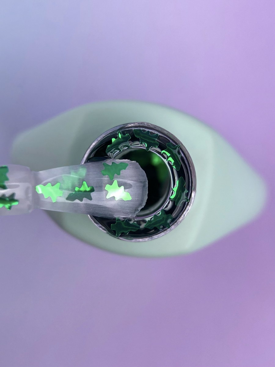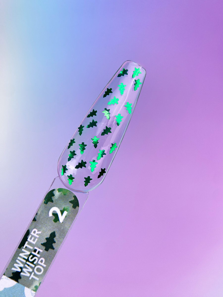 Top Winter wish №2 - це топ з зеленими ялинками, без липкого шару, який буде гармонійно виглядати з будь-яким кольором на нігтях. Він здатний зробити ваш манікюр цікавим та незвичайним.