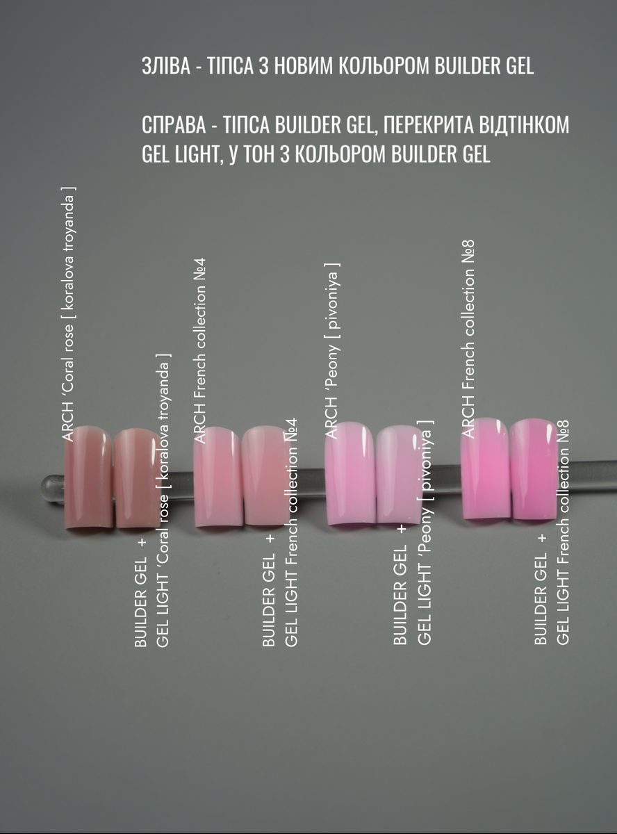 Парна робота із BUILDER GEL (для зміцнення, нарощення та укріплення) плюс доповнення GEL LIGHT в тон - запорука швидкості у роботі та якісного результату.