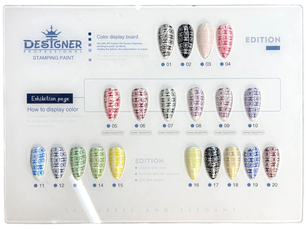 Лак-фарби Дизайнер Професіонал надані у різноманітних кольорах, виготовлені з високоякісної французької сировини, оптимально щільні, з правильною консистенцією, ідеально пігментовані, зручні у нанесенні та сохнуть на повітрі всього за кілька секунд, тому необхідно дуже швидко працювати, щоб бажаний малюнок максимально чітко продрукувався.