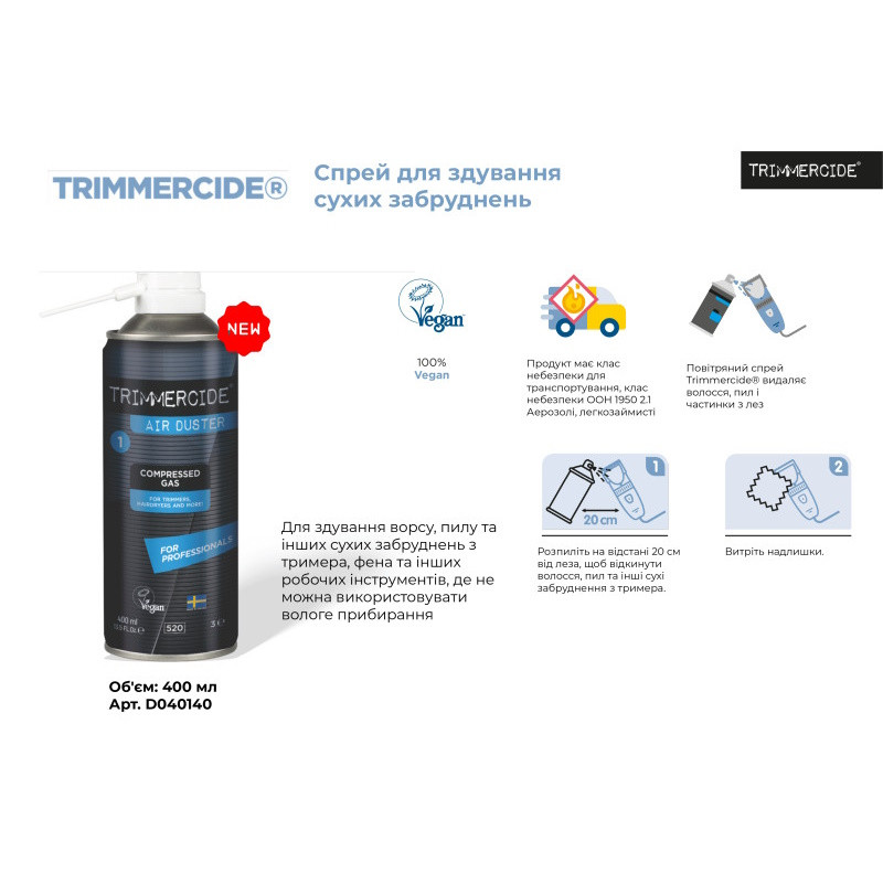 Trimmercide Air Duster — це ідеальне рішення для очищення ваших інструментів від пилу, ворсу та інших сухих забруднень. Цей аерозольний спрей забезпечує потужний струмінь повітря, який ефективно видуває всі частинки без залишків. Ідеально підходить для очищення тримерів, фенів та інших робочих інструментів, де використання вологого очищення є неможливим або небажаним.