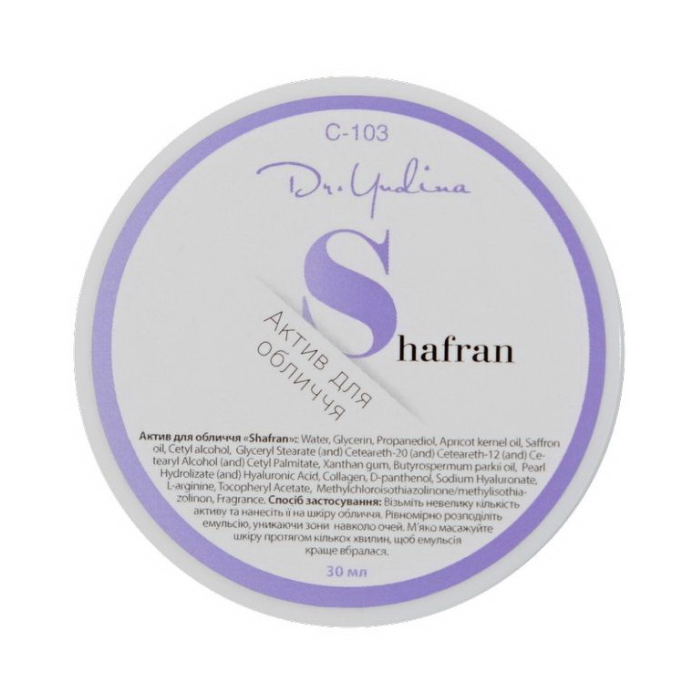 Актив для обличчя “Shafran” Склад: Water, Glycerin, Propanediol, Apricot kernel oil, Saffron oil, Cetyl alcohol, Glyceryl Stearate (and) Ceteareth-20 (and) Ceteareth-12 (and) Ce- tearyl Alcohol (and) Cetyl Palmitate, Xanthan gum, Butyrospermum parkii oil, Pearl Hydrolizate (and) Hyaluronic Acid, Сollagen, D-panthenol, Sodium Hyaluronate, L-arginine, Tocopheryl Acetate, Methylchloroisothiazolinone/methylisothia- zolinon, Fragrancе