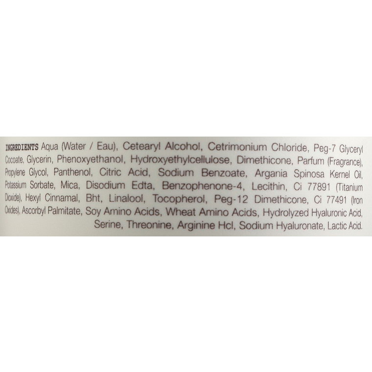 Aqua (water, eau), cetearyl alcohol, cetrimonium chloride, peg-7 glyceryl cocoate, glycerin, phenoxyethanol, hydroxyethylcellulose, dimethicone, parfum (fragrance), propylene glycol, panthenol, citric acid, sodium benzoate, argania spinosa kernel oil, potassium sorbate, mica, disodium edta, benzophenone-4, lecithin, ci 77891 (titanium dioxide), hexyl cinnamal, bht, linalool, tocopherol, peg-12 dimethicone, ci 77491 (iron oxides), ascorbyl palmitate, soy amino acids, wheat amino acids, hydrolyzed hyaluronic acid, serine, threonine, arginine hcl, sodium hyaluronate, lactic acid