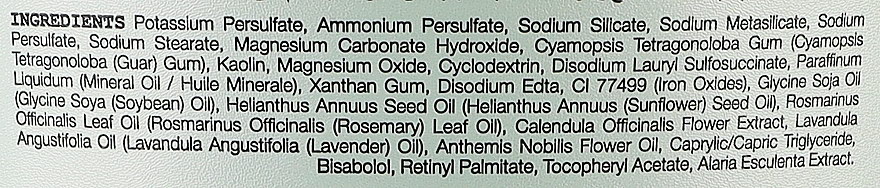 Potassium Persulfate, Ammonium Persulfate, Sodium Silicate, Sodium Metasilicate, Sodium Persulfate, Sodium Stearate, Magnesium Carbonate Hydroxide, Cyamopsis Tetragonoloba Gum (Cyamopsis Tetragonoloba (Guar) Gum), Kaolin, Magnesium Oxide, Cyclodextrin, Disodium Lauryl Sulfosuccinate, Paraffinum Liquidum (Mineral Oil/Huile Minerale), Xanthan Gum, Disodium Edta, Cl 77499 (Iron Oxides), Glycine Soja Oil (Glycine Soya (Soybean) Oil), Helianthus annuus Seed Oil, (Helianthus Annuus (Sunflower) Seed Oil, Rosmarinus Officinnalis (Rosemary) leaf Oil), Calendula Officinnalis Flower Extract, Lavandula Angustifolia (Lavander) Oil), Anthemis Nobilis Flower Oil, Caprylic/Capric Triglyceride, Bisabolol, Retinyl Palmitate, Tocopheryl Acetate, Alaria Esculenta Extract.
