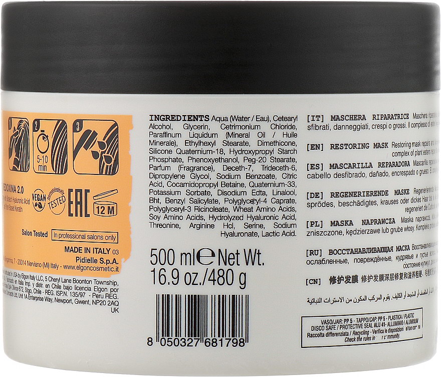 Aqua (Water/Eau), Cetearyl Alcohol, Glycerin, Cetrimonium Chloride, Paraffinum Liquidum (Mineral Oil / Huile Minerale), Ethylhexyl Stearate, Dimethicone, Silicone Quaternium-18, Hydroxypropyl Starch Phosphate, Phenoxyethanol, Peg-20 Stearate, Parfum (Fragrance), Deceth-7, Trideceth-6, Dipropylene Glycol, Sodium Benzoate, Citric Acid, Cocamidopropyl Betaine, Quaternium-33, Potassium Sorbate, Disodium Edta, Linalool, Bht, Benzyl Salicylate, Polyglyceryl-4 Caprate, Polyglyceryl-3 Ricinoleate, Wheat Amino Acids, Soy Amino Acids, Hydrolyzed Hyaluronic Acid, Threonine, Arginine Hcl, Serine, Sodium Hyaluronate, Lactic Acid.