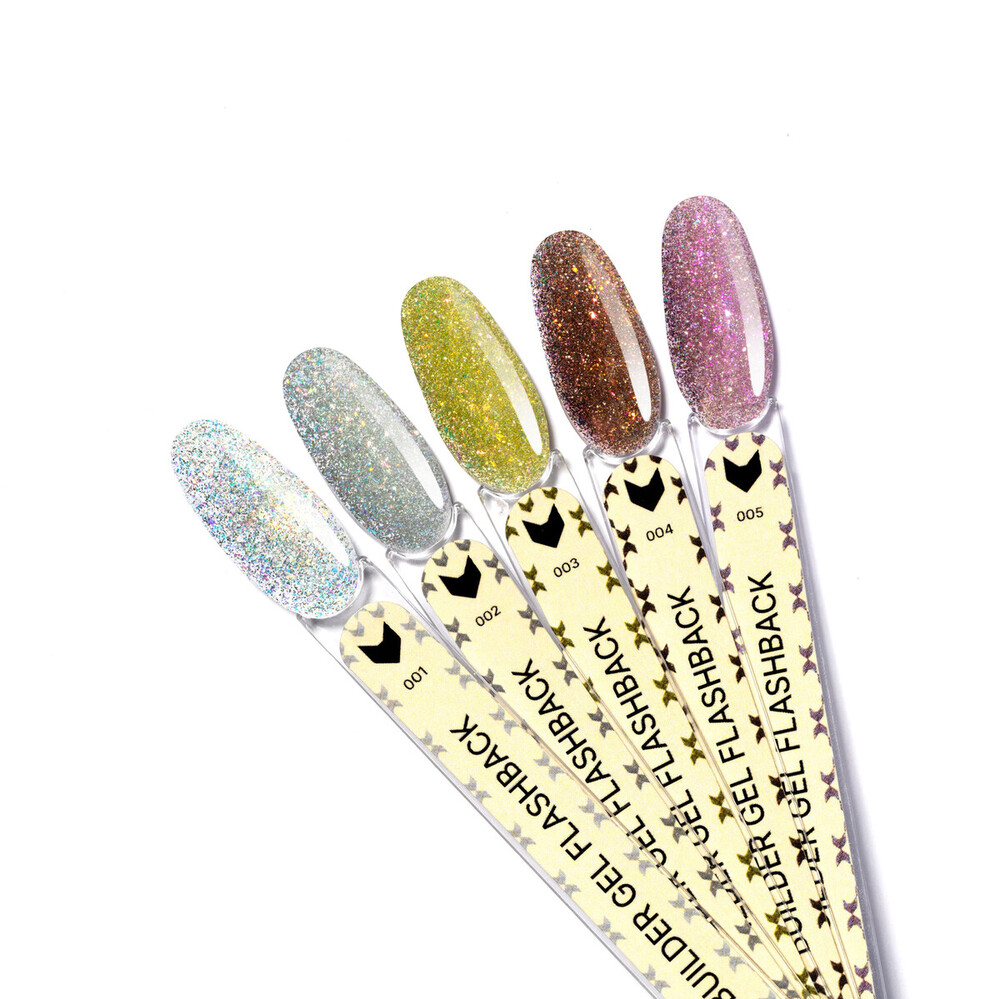 F.O.X Builder Gel Flashback - колекція світловідбивних будівельних гелів, що поєднує технологічність, міцність та ефектне сяйво. 002 - сріблясто-холодний колір, має ніжний перелив із дрібними голографічними блискітками.