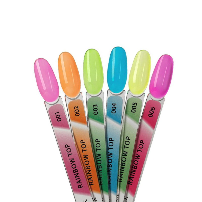 F.O.X Top Rainbow - вітражний топ без липкого шару. Може використовуватися поверх будь-якого покриття, включаючи прозоре. Надає ефектну глибину. Дозволяє робити мінімальне вирівнювання, створювати омбре та соковитий градієнт. Забезпечує міцний захист від механічних пошкоджень, зберігає колір і має стійкий глянцевий блиск. Завдяки еластичній текстурі, яка зберігається після полімеризації, топ не допускає появи тріщин на манікюрному покритті та добре носиться.