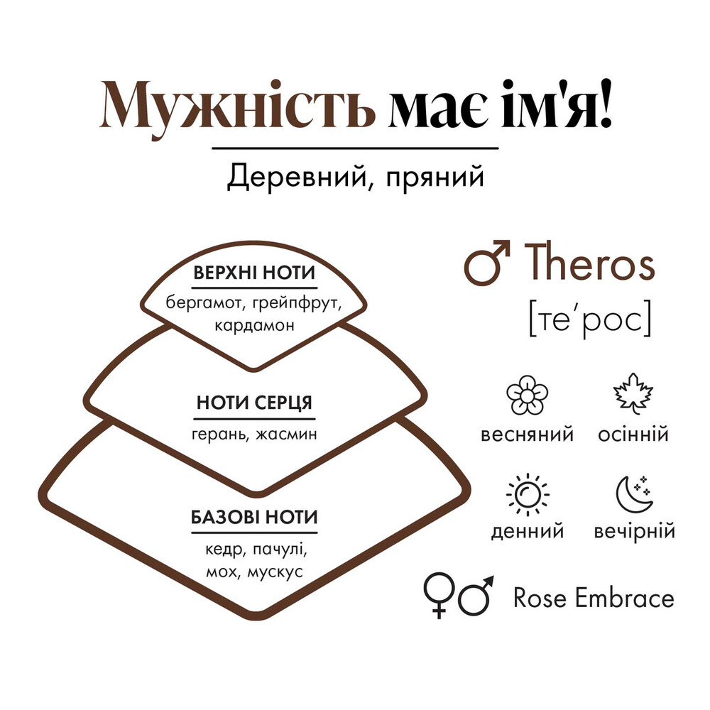 Чоловіча парфумована вода Farmasi Theros For Men відкривається невгамовним цитрусовим дуетом свіжої бергамоту, що бадьорить, і пікантної гіркуватості грейпфрута, приправлених дрібкою пекуче-спекотного кардамону.