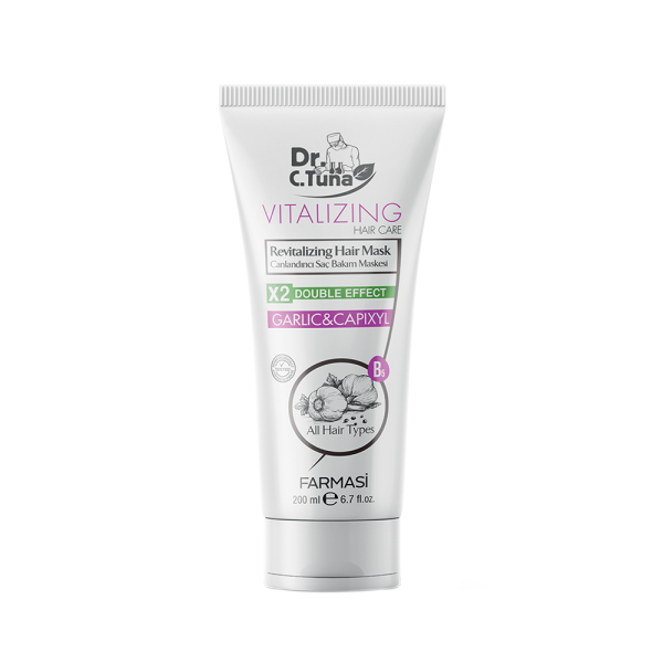 Dr. C. Tuna оживляюча – реанімуюча маска збагачена екстрактом часнику та капіксилу. Прискорює ріст волосся і запобігає їх випаданню, роблячи вашу зачіску більш пишною. Надає шовковистість і м'якість тонкому і ламкому волоссю. Легка і нежирна формула забезпечує ідеальний догляд за ослабленим волоссям.Маска для волосся з екстрактом часнику Vitalizing - це комплексний догляд відновлення волосся.Часник - велике джерело сірки, яка живить волосся білком і зменшує сальність шкіри голови. Ще одним чарівним компонентом є селен, який потрібен для того, щоб повністю засвоїти вітамін Е. Знову ж таки, красиве і здорове волосся без цього вітаміну неможливо. А також тут міститься ще один дуже корисний компонент Вітамін С, що синтезує колаген.Екстракт часнику – це компонент, який часто використовують при створенні ефективних косметичних засобів. Нічого дивного в цьому немає, адже часник багатий на корисні активні речовини. Саме тому маска від бренду Farmasi дозволить швидко провести відновну терапію ослабленого та пошкодженого волосся.Активні компоненти маски відновлюють структуру стрижнів волосся, зміцнюють волосяні фолікули та стимулюють зростання здорового волосся. Маска позитивно впливає на шкіру голови, оскільки стимулює регенерацію клітин, нормалізує кровообіг. Також засіб контролює вироблення шкірного сала, проводить профілактику появи лупи. Стан волосся значно покращиться завдяки використанню такої маски.