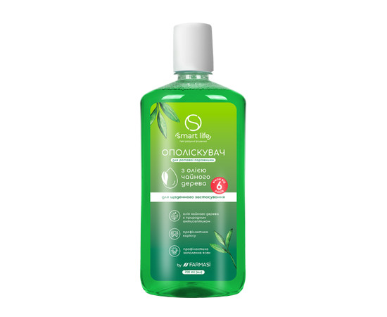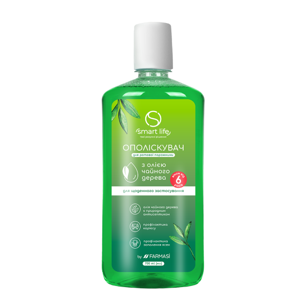 Ополіскувач для ротової порожнини з олією чайного дерева Smart Life для щоденного використання. Олія чайного дерева, через свої корисні властивості, активно використовується в стоматології. Вона має антисептичний та антибактеріальний ефект, а також цілюще впливає на ясна, зменшуючи їх кровоточивість. Олія чайного дерева є ефективною в профілактиці карієсу.