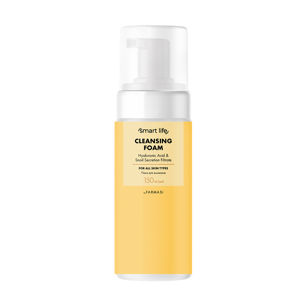 Пінка для вмивання з гіалуроновою кислотою та фільтратом секреції равлика Smart Life для всіх типів шкіри призначена для м'якого очищення епідермісу від надлишків себуму, залишків косметичних засобів та інших забруднень. Гіалуронова кислота у складі засобу сприяє інтенсивному зволоженню, підвищує пружність та еластичність шкірного покриву. Фільтрат секреції равлика стимулює регенерацію, зменшує подразнення та підтримує необхідний рівень гідратації шкіри. Пантенол має загоювальну та протизапальну дії.