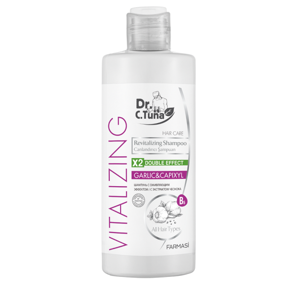 Dr. C. Tuna Farmasi Vitalizing Garlic оживляючий-реанімуючий шампунь містить часник й капіксил, які є чудовими засобами для ламкого волосся. Реанімує пошкоджене волосся і живить його, обволікаючи кожну волосинку. При регулярному використанні зміцнює посічене волосся, запобігає появі лупи і надає йому блиску та здорового вигляду. Шампунь сприяє посиленому росту волосся та його відновленню. Екстракт часнику живить і зміцнює волосся. Регулярне застосування шампуню допоможе зробити волосся привабливим і здоровим, адже Farmasi піклується не тільки про зовнішню красу, а й про здоров'я шкіри голови. Не містить барвників, парабенів, силіконів, триклозанів та формальдигідів. Можна використовувати щодня.