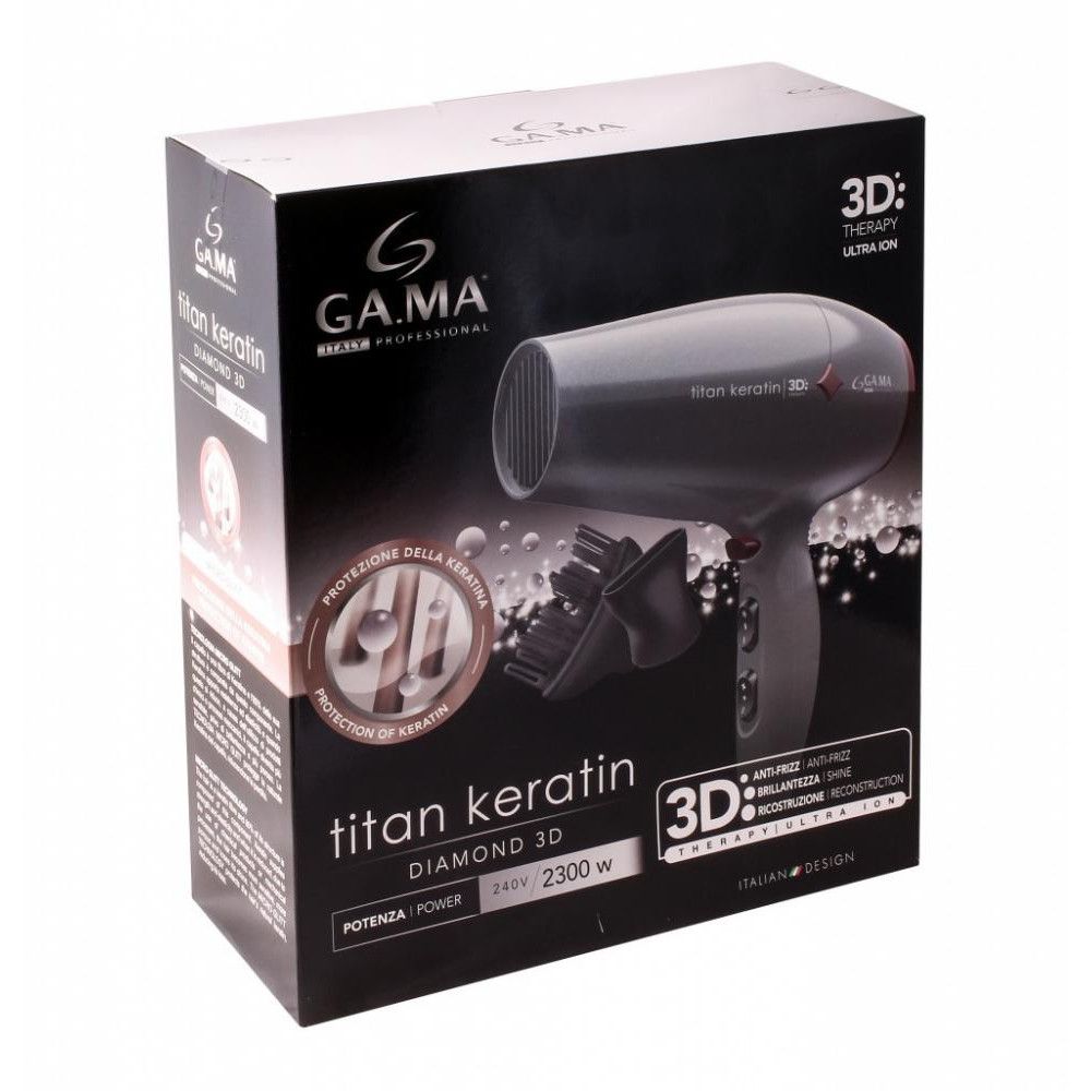 Виснаження кератину призводить до послаблення здоров'я волосся – втрати сили, блиску та еластичності. Саме тому GAMA розробила новітні моделі інструментів, здатних захищати креатин волосся, до яких входить новинка – фен GAMA Titan Keratin Diamond 3D (GH0303).