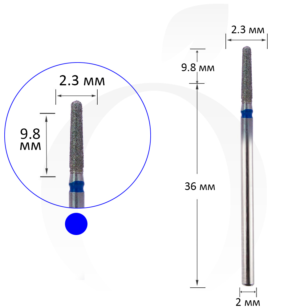 Фреза алмазна конус закруглений синя 2.3 мм, робоча частина 9.8 мм