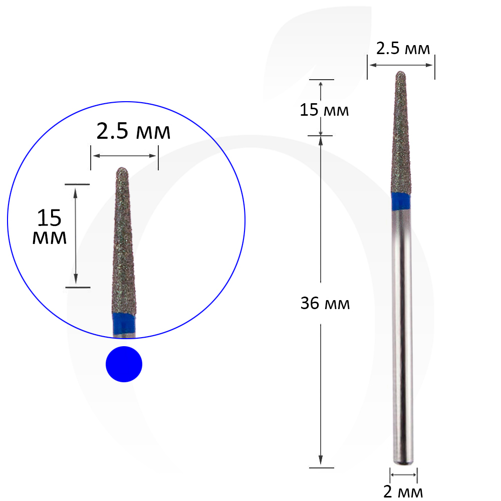 Фреза алмазна конус закруглений синя 2.5 мм, робоча частина 15 мм