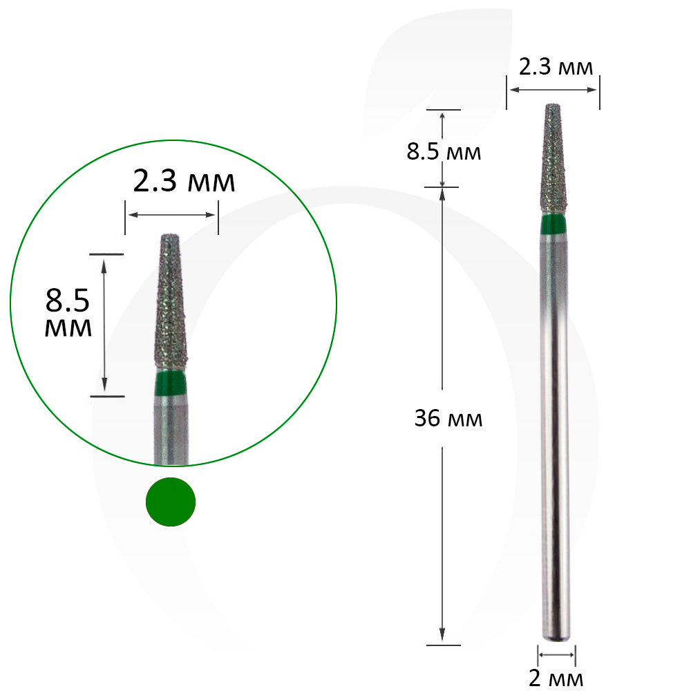 Фреза діамантова конус зелена 2.3 мм, робоча частина 8.5 мм