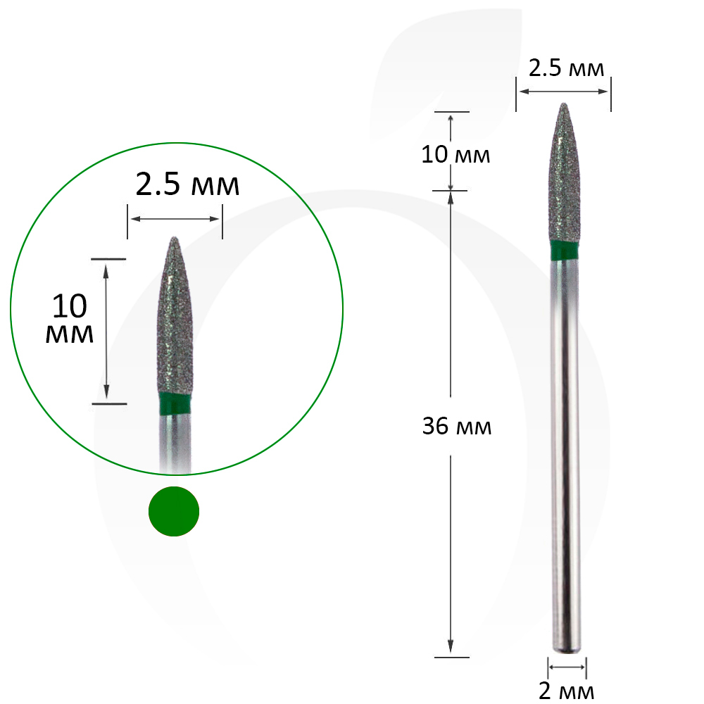 Фреза алмазна конус зелена 2.5 мм, робоча частина 10 мм