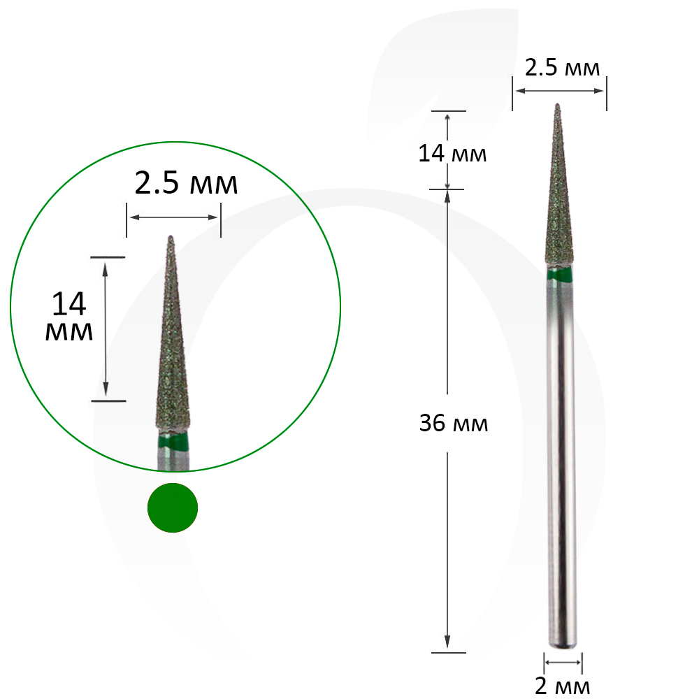 Фреза алмазна конус зелена 2.5 мм, робоча частина 14 мм