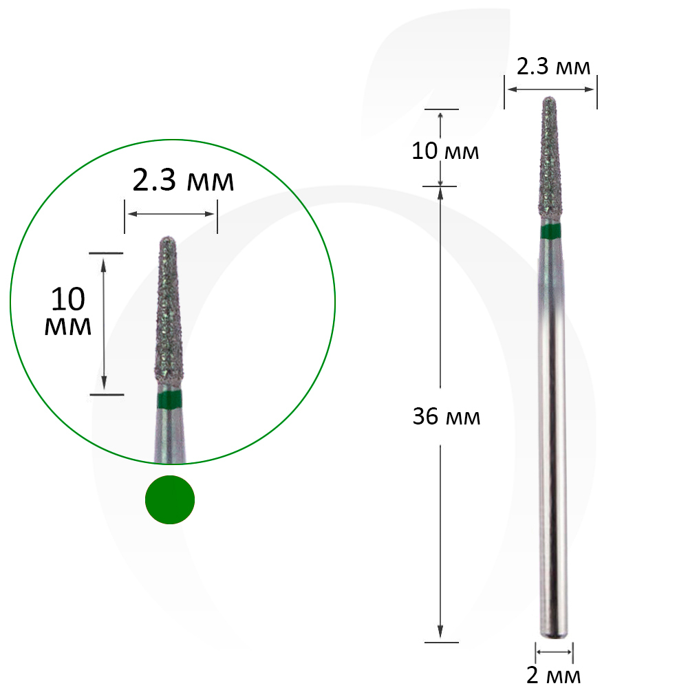 Фреза алмазна конус закруглений зелена 2.3 мм, робоча частина 10 мм