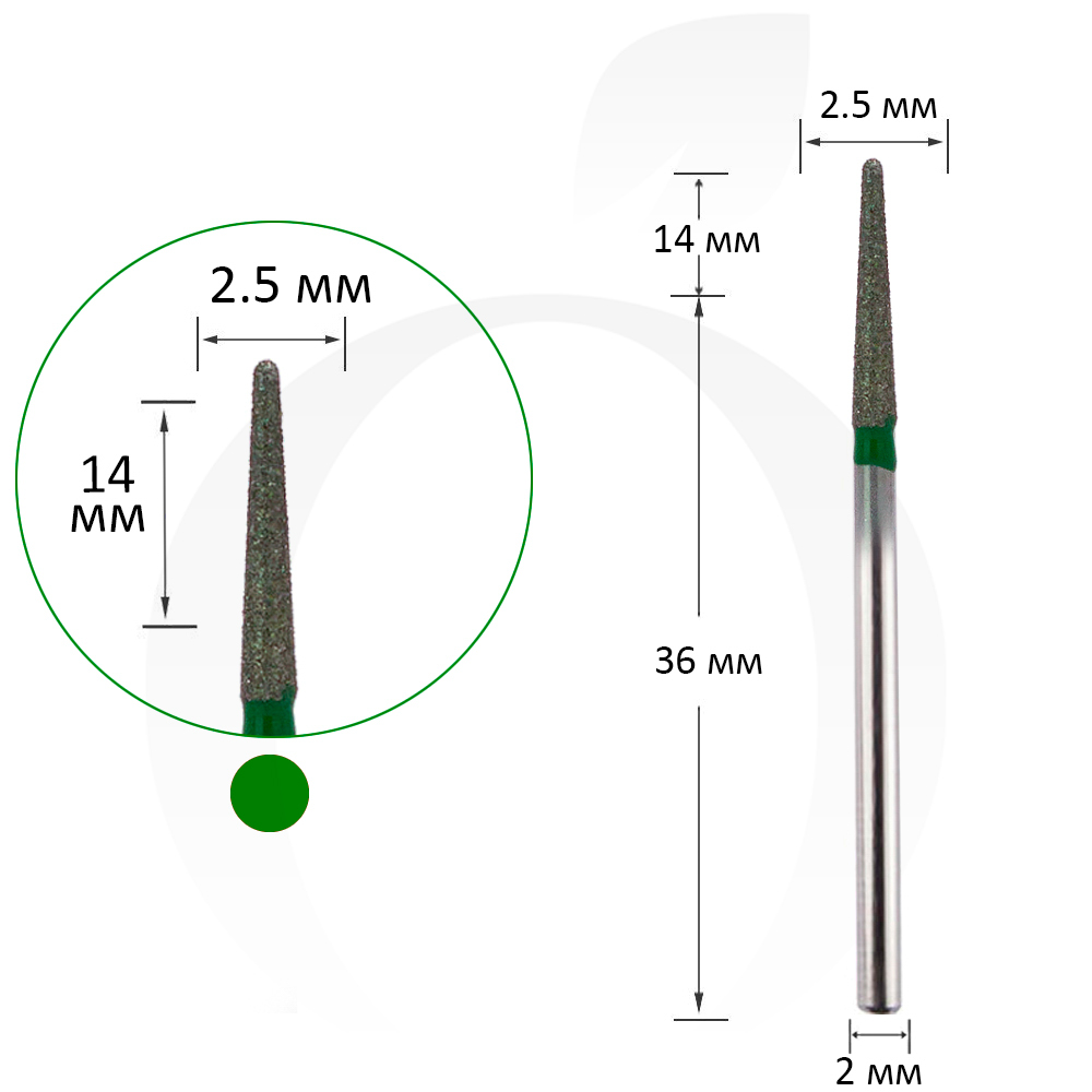 Фреза алмазна конус закруглений зелена 2.5 мм, робоча частина 14 мм