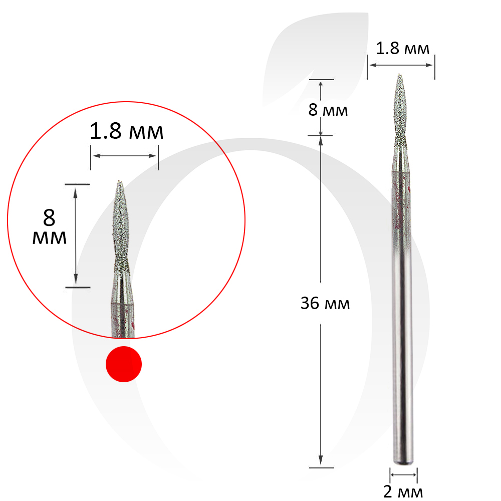 Фреза алмазна куля червона 1.8 мм, робоча частина 8 мм