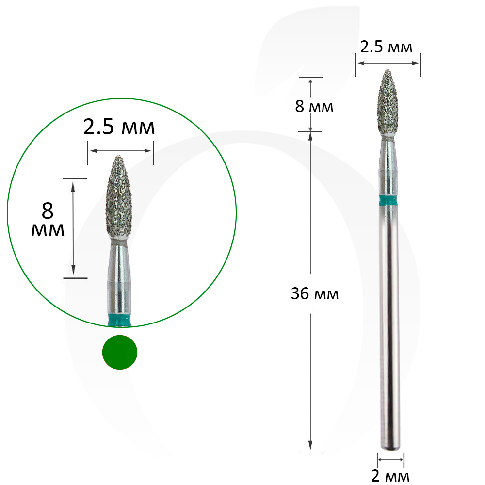 Фреза алмазна полум'я зелена 2.5 мм, робоча частина 8 мм
