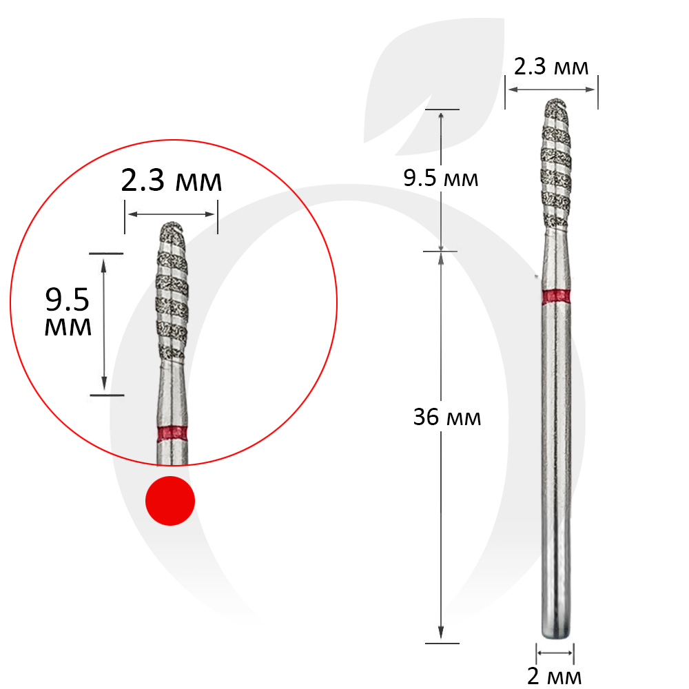 Фреза алмазна торнадо куля червона 2.3 мм, робоча частина 9.5 мм