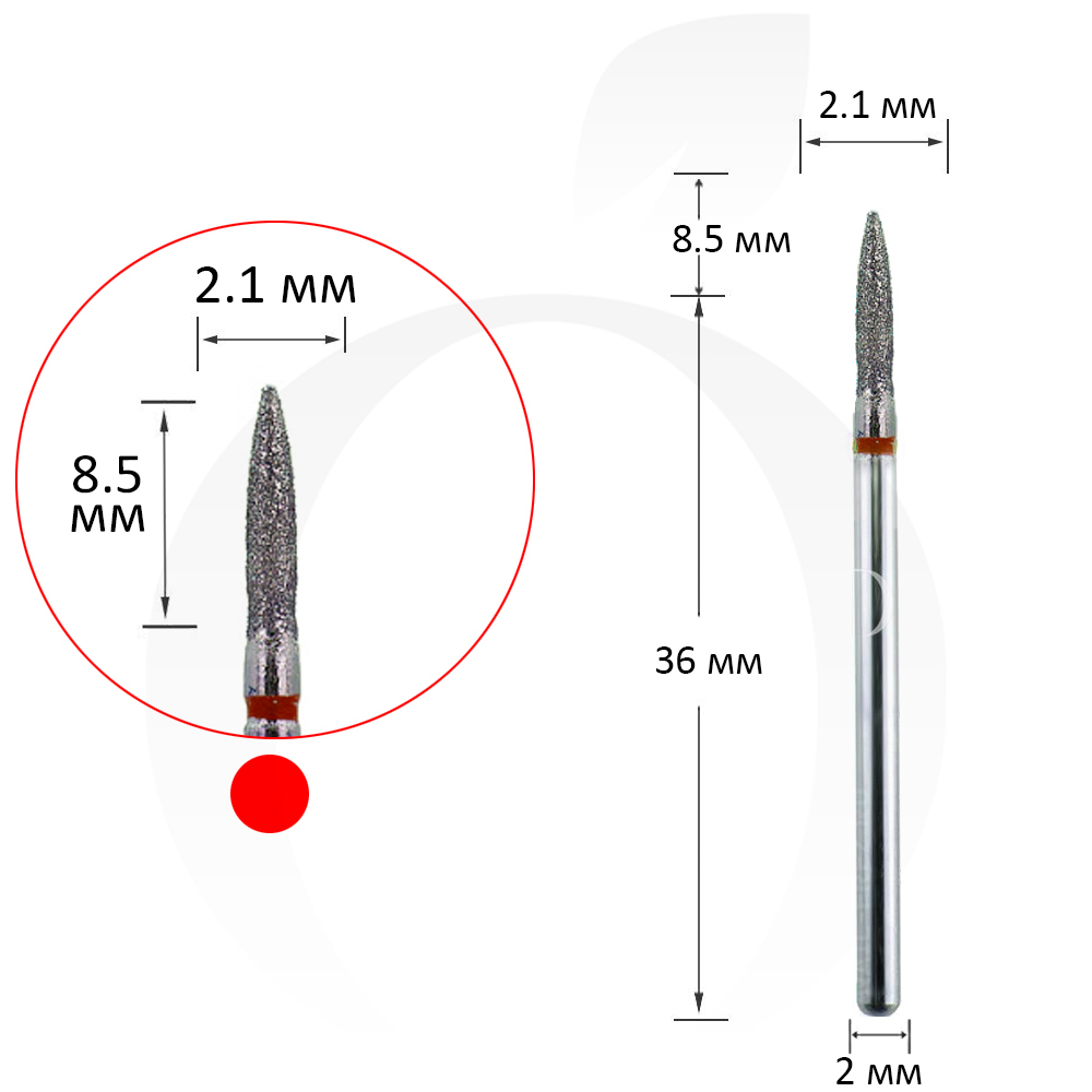 Фреза алмазна полум'я червоне 2.1 мм, робоча частина 8.5 мм