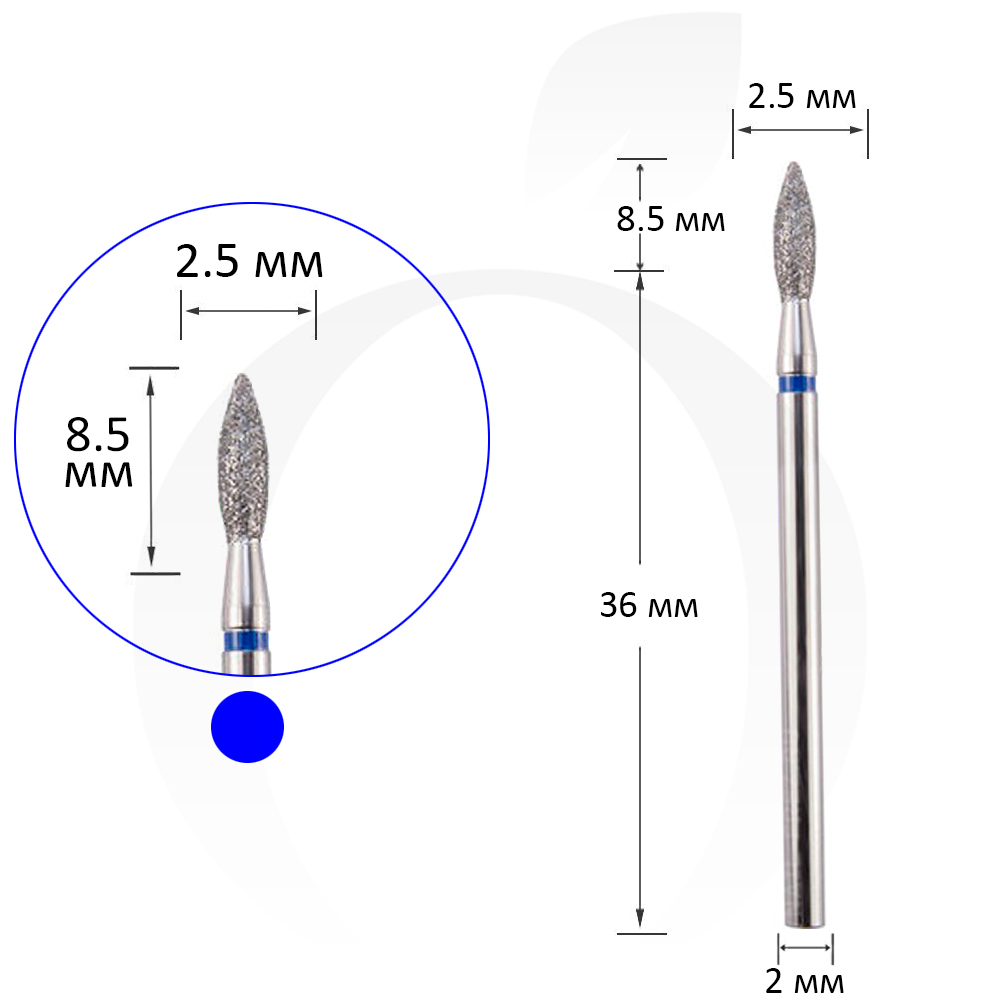 Фреза алмазна полум'я синя 2.5 мм, робоча частина 8.5 мм